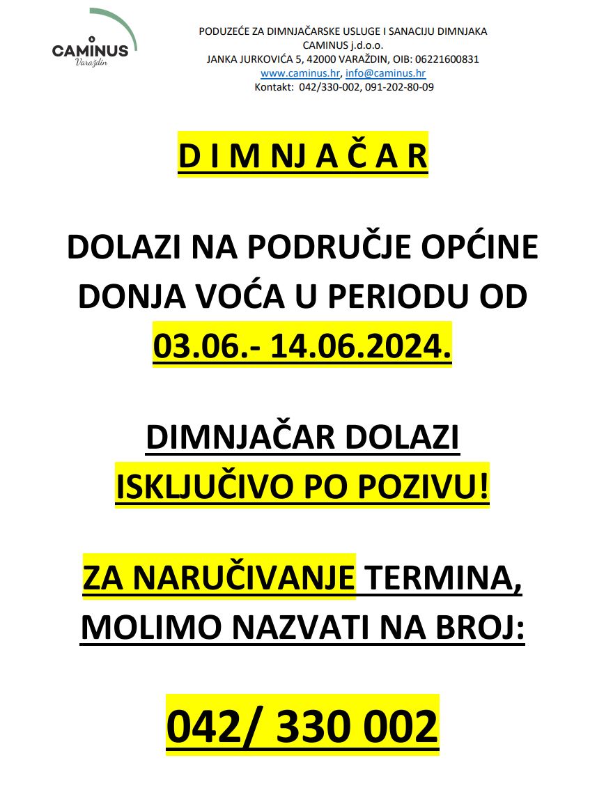 Obavijest o dolasku dimnjačara u Općinu Donja Voća